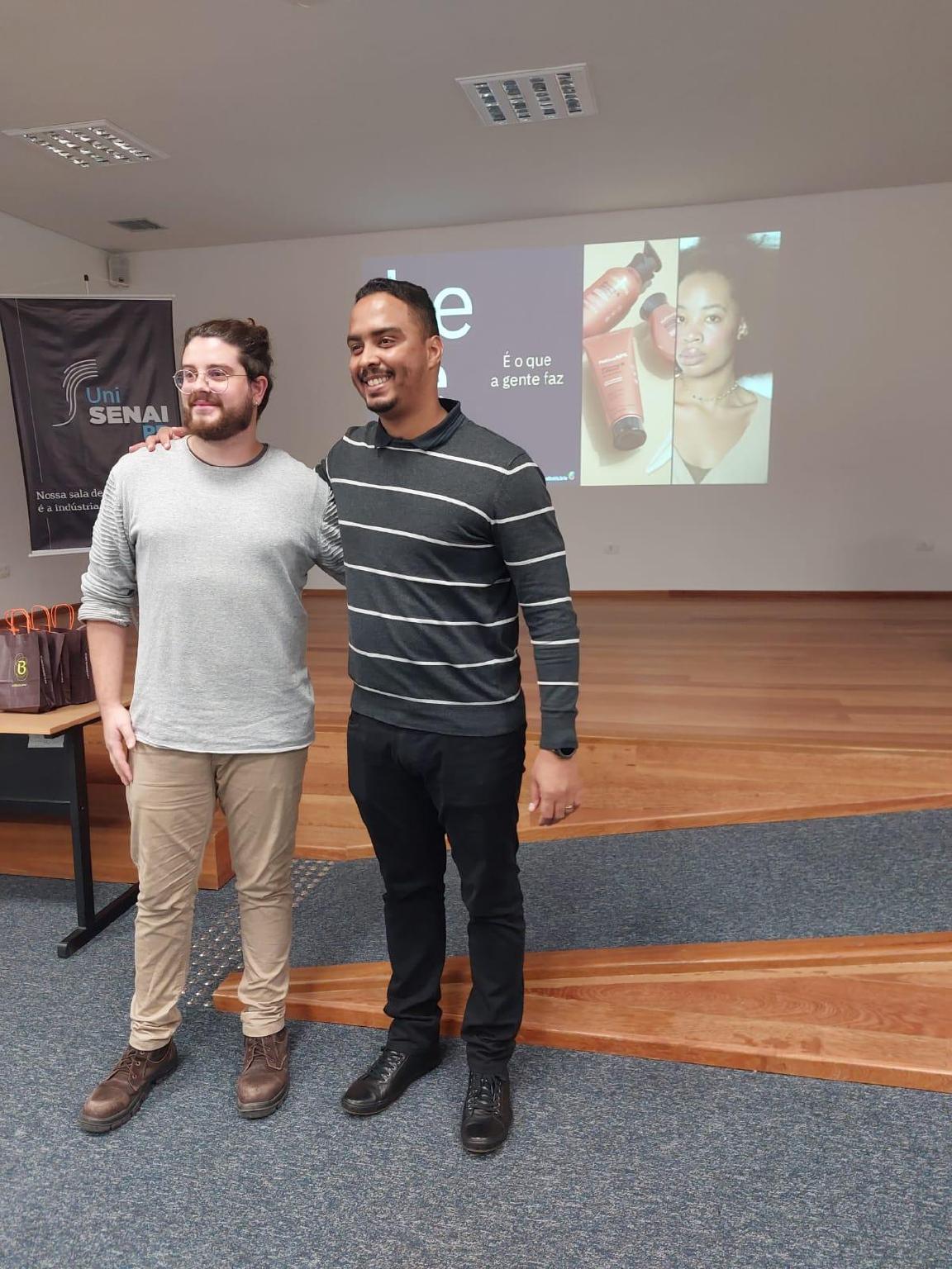 Nesta semana, a Escola Sesi de Referência da Indústria, de São José dos Pinhais, recebeu representantes do Grupo Boticário para conversarem com os alunos sobre “A importância da educação para a indústria”. Ao longo da vida, Matheus Novitzki Bueno e André Menezes Silva estudaram no Sesi e no Senai e, por isso, comentaram sobre o impacto da educação para o crescimento deles dentro da empresa.
